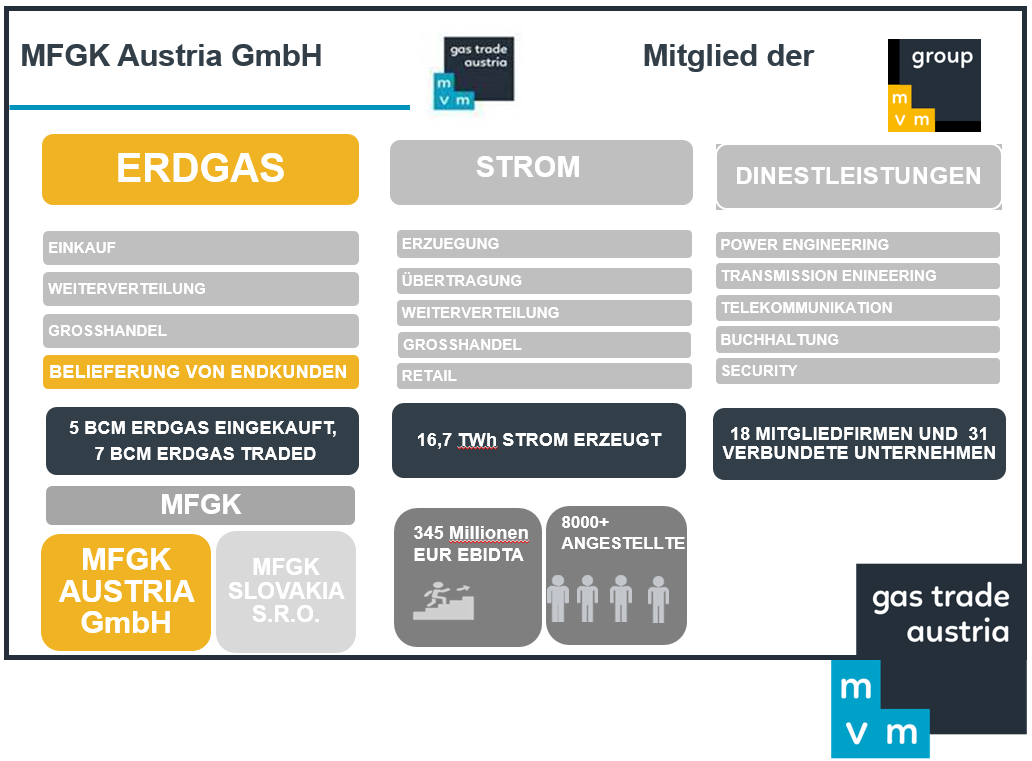 Die Geschäftstätigkeit von MVM umfasst die gesamte Wertschöpfungskette des ungarischen Energiesektors. Mit der lokalen Präsenz der MFGK Austria als Teil der MVM-Gruppe ist es erklärtes Ziel der MVM sich am österreichischen Energiemarkt als Schlüsselakteur zu etablieren.